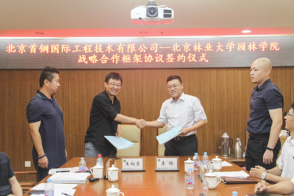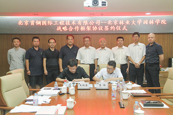 7月13日,首鋼國際工程公司與北京林業大學園林學院戰略合作框架協議簽約儀式在北京林業大學舉行,首鋼國際工程公司黨委書記、董事長李楊,公司副總工、建筑市政分公司總經理向春濤,戰略技術部部長頡建新,組織人事部部長朱小軍,建筑市政分公司總圖規劃事業部總經理尚國普,總圖規劃事業部園林專業負責人朱江出席簽約儀式,北京林業大學園林學院黨委書記張敬、院長王向榮教授、黨委副書記劉堯參加簽約儀式。首鋼國際工程黨委書記、董事長李楊和北京林業大學園林學院院長王向榮在戰略合作框架協議上簽字。