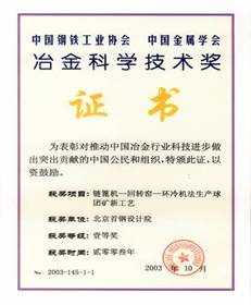 2000年,率先開(kāi)發(fā)成功的鏈篦機(jī)-回轉(zhuǎn)窯-環(huán)冷機(jī)球團(tuán)技術(shù)填補(bǔ)了中國(guó)大型球團(tuán)技術(shù)的空白,并完成國(guó)內(nèi)第一條120萬(wàn)t/a規(guī)模鏈篦機(jī)-回轉(zhuǎn)窯-環(huán)冷機(jī)生產(chǎn)線建設(shè),獲冶金科技進(jìn)步一等獎(jiǎng)。